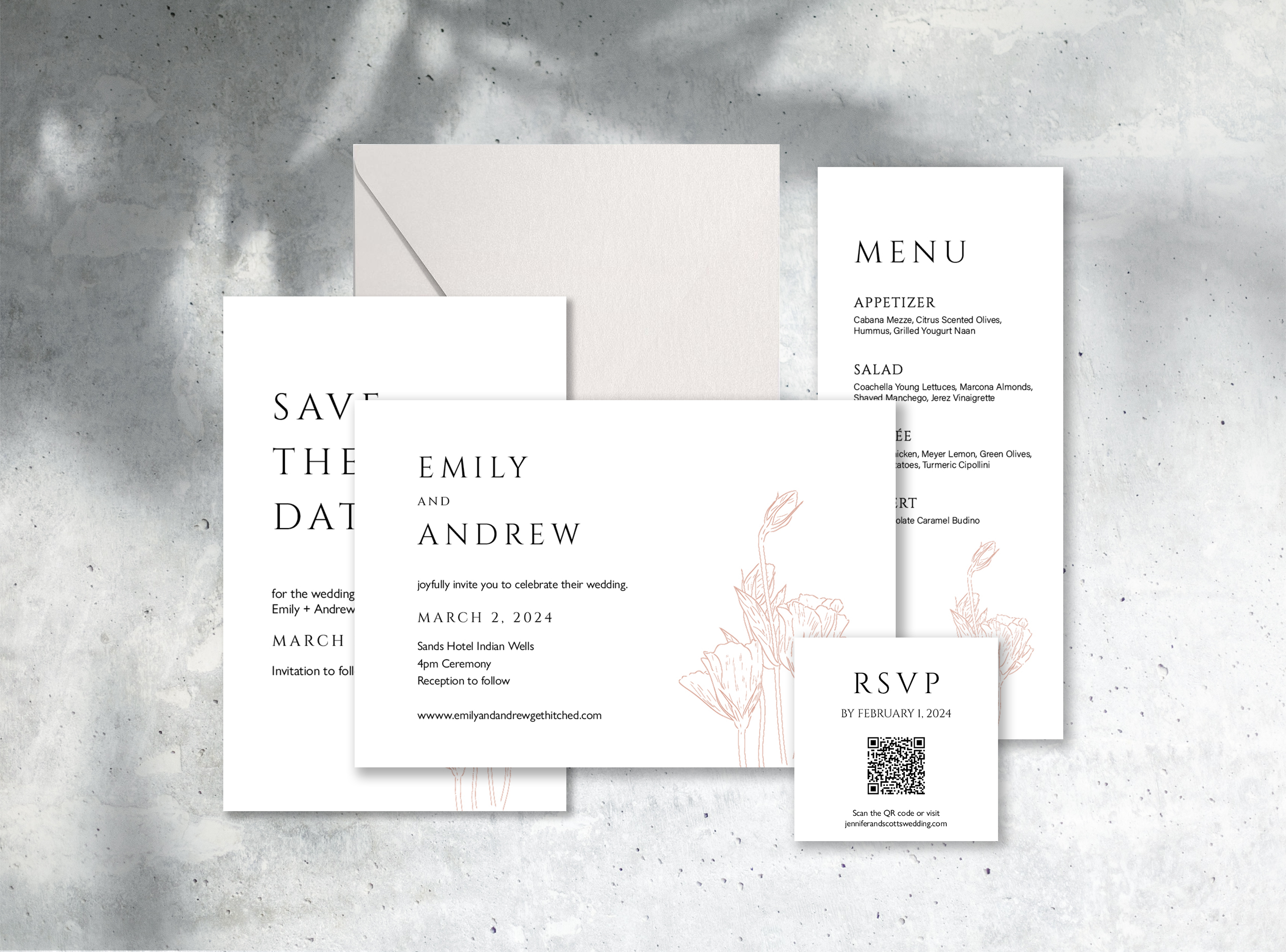 This sublime design incorporates a clean, bold look, pairing eye-catching typography with elegant lines. Modern Muse can be customized with your favorite color palette to match any wedding aesthetic.